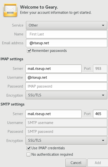 mail.riseup.net, leave the port at 993. If you want to connect via Riseups Tor service, see below. - Enter your Riseup username and password